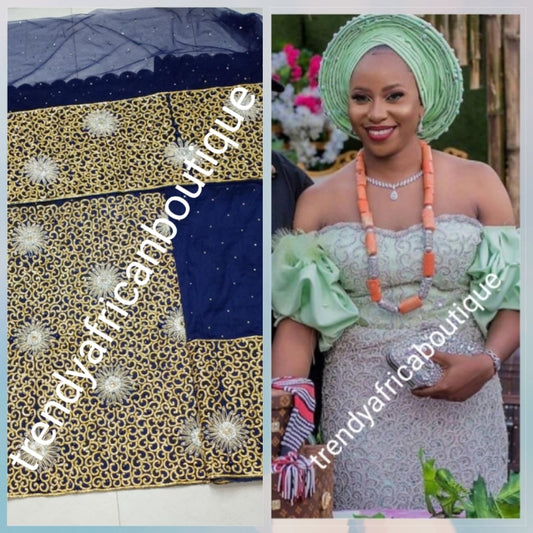 Sale: Ready to ship: Navy blue/Gold first Lady/ VIP Nigerian Celebrant Silk George wrapper. All over hand cut with gold crystal stones in flower design. 2 wrapper (2.5yd each) + 1.8yds net for blouse. Niger/Igbo/delta bridal outfit wrapper