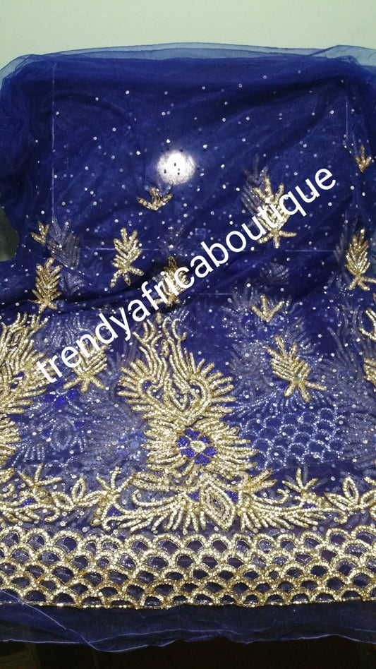 • Royal blue VIP Net George wrapper. All over dazzling crystal stones design, handcut border. Very rich and classic. 5yds+ 1.8yds matching for blouseblouse.
