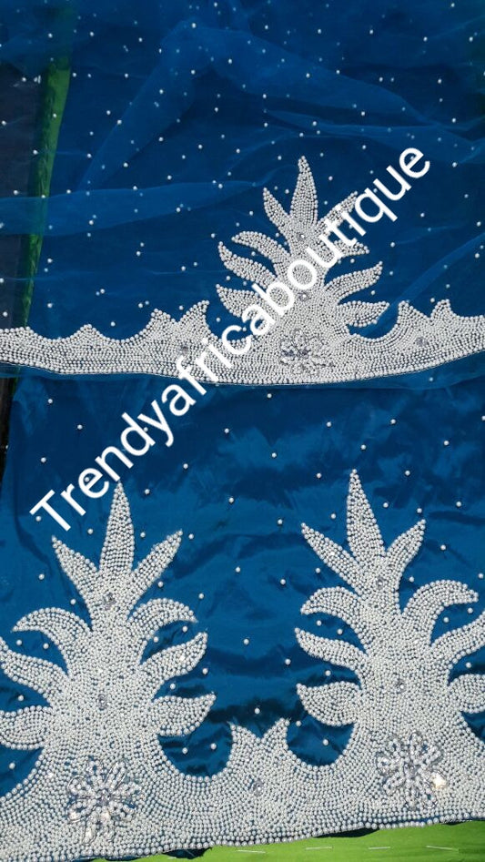 • Fully Beaded pearl design. Nigerian,VIP beaded George wrapper. Beautiful Blue Wrapper and 1.8yds matching blouse. Original Silk George