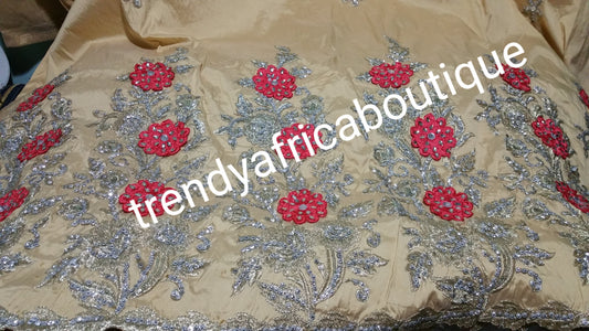 • Nigerian Tranditional George wrapper. Embriodery/stones design in Champagne/coral red matching blouse. Small-George.