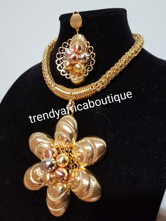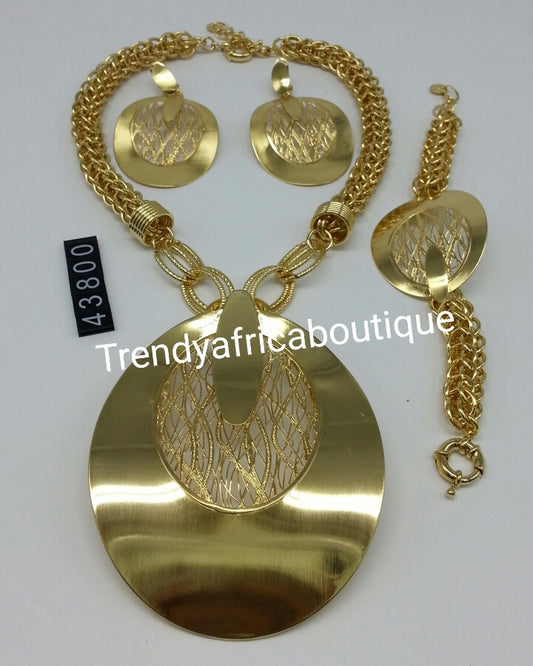 Big pendant/earrings 18k Gold plated Dubai costume jewelries set. High quality plating, hypoallergenic necklace and earrimgs necklace set. Sold as a set