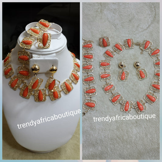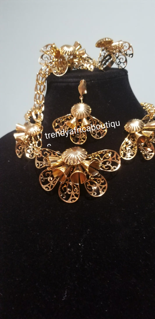 • 18k high quality Gold plating Dubai Jewelry set. 4pca necklace, earrings, bangle,  ring set. African party Jewelry set.