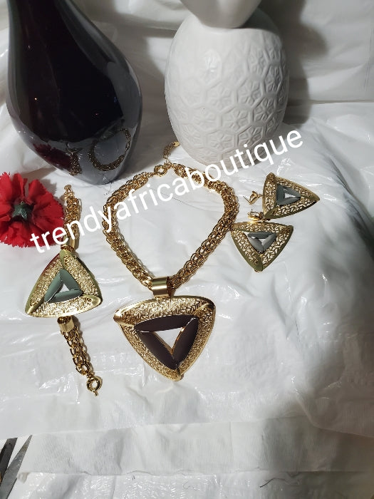 • 3pcs. Latest Jewelry set.  18k Gold plated Dubai necklace set for Nigerian big party. High quality plating. Available in Silver plating. Sold as a set. Price is for set