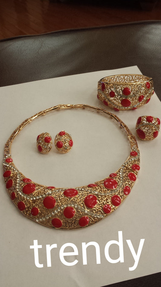 4pc omega necklace set. 18K gold plating with Red beads accent. Hypoallergenic quality