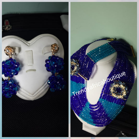 • Sale: Multi Rows royal blue/turquoise beaded necklace/jewelry set. Nigerian wedding beads in 3 piece set. Also have coral-necklace set