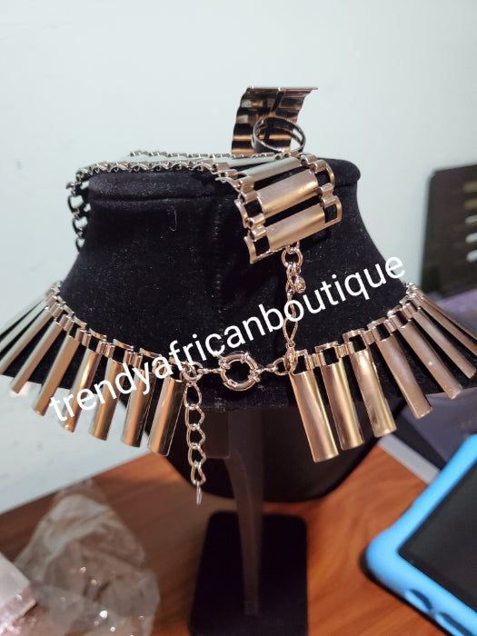 Choker silver plated high quality 4pcs necklace set. Jewelry set for church and party wear. Classic drop choker Necklace, earrings, open ring & bracelet. High quality & hypoallergenic plating. Open ring for easy adjustment