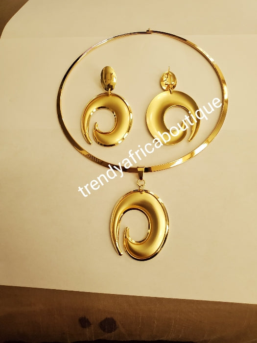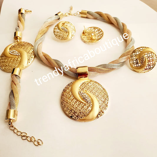 18k gold-plated high quality 4pcs necklace set. Jewelry set for church and party wear. Bold Necklace, earrings,ring, & bangle. High quality & hypoallergenic plating. Open ring for easy adjustment
