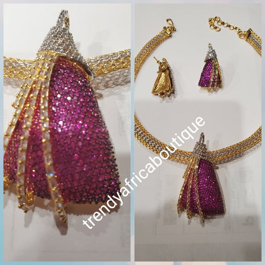 3pcs 22k quality 2 tone Gold electroplating choker set. magenta CZ dazzling stone setting mounted on Pendant/earrings + neck chan as a set. Top quality/hypo allergenic plating
