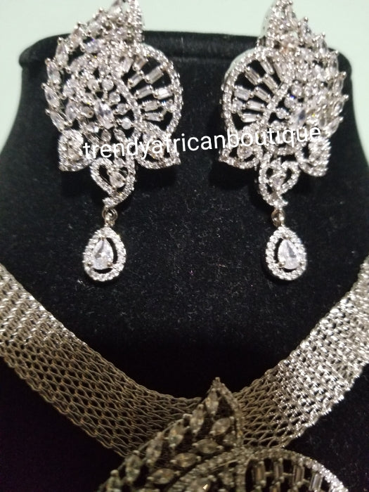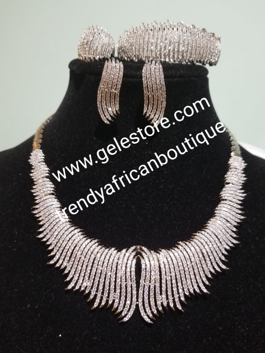 New arrival Celebrants 4pcs Bridal set: 22k white/silver Electroplated with dazzling CZ stones setting. Bridal piece of accessories, hypoallergenic. Necklace, earrings, ring Is open for finger adjustment and a matching bangle set.
