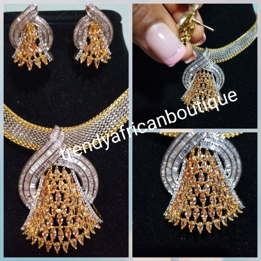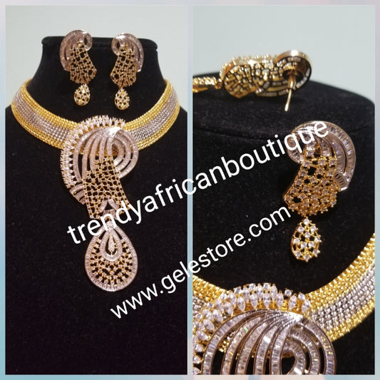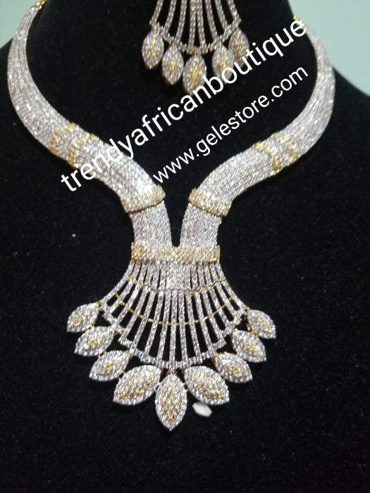 Sale: New arrival Celebrants 4pcs Bridal set: 22k Electroplated with dazzling white/gold CZ stones setting. Bridal piece of accessories, hypoallergenic. Necklace, earrings, ring Is open for finger adjustment and a matching bangle set.