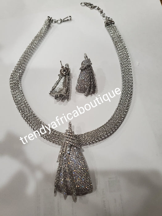 3pcs 22k quality white/silver electroplating in choker set. Sold as a set. Pendant is mounted with crystal CZ diamond stones. Top quality/hypo allergenic plating. pendant with 17" long necklace