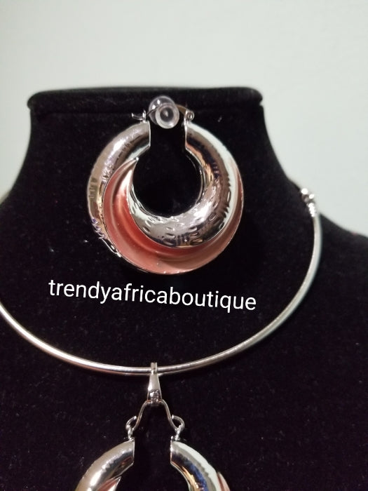Latest high quality silver plated hoop pendant/earrings set with Omega chain. 2 tone pendant/earrings. Sold as a set. Price is for the set. The chain have extender with the hook at the back for fitting adjustment