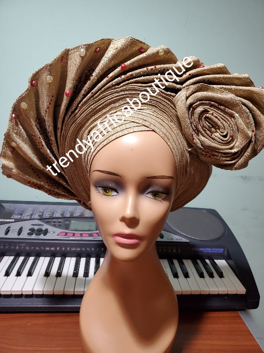 New arrival champagne gold auto-gele fan design beaded and stoned. made with Nigerian woven aso-oke. Party ready in less than 5 minutes. One size fit, easy adjustment at the back