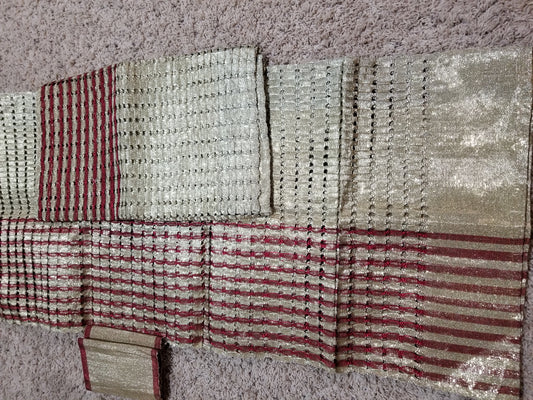 • 3pcs set Gold/wine Aso-oke gele/ipele/fila. Latest metalic aso-oke in basket design. Sold as a set. Use for Nigerian traditional wedding accessories for bride amd and groom. Top quality aso-oke woven in mother land.