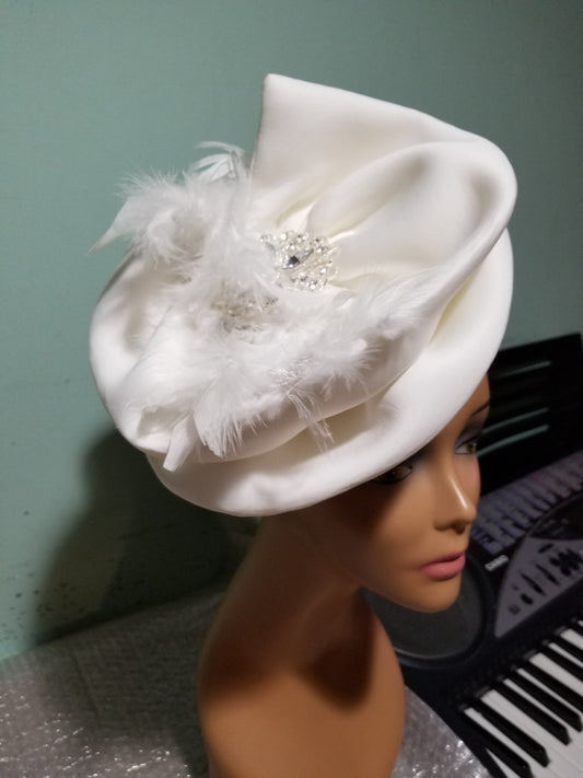 Off White turban design with white feather. Dress it up to chure or party. Women-turban. One size fit all turban. Beautiful design with a side brooch to add decor to your turban