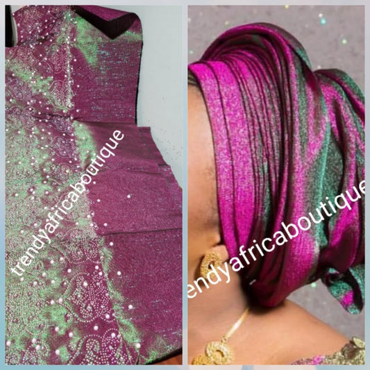 Magenta/green Latest metallic 2 tone aso-oke gele Bedazzled with shinning crystal stones and pearls. Sold as Gele only. Nigerian Traditional Aso-oke head wrap for party wear