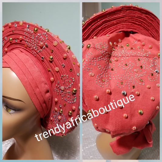 Sweet Coral Auto-gele made with quality Aso-oke. Beaded and stoned work front and back to perfection. One size fit, easy to adjust for fit and knot at the back to secure your gele. This is true original auto gele