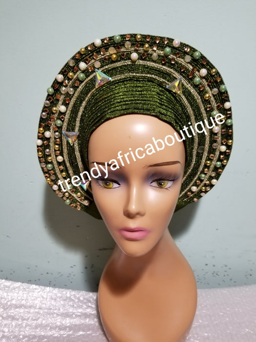 Metallic Olive green/champagne aso-oke embellished with beads auto-gele. Wahala free gele already made for you with finest quality aso-oke. Easy adjustment for proper fit at the back. Original quality from Nigeria.