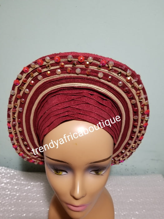 Wine/champagne aso-oke embellished with beads/stones auto-gele. Wahala free gele already made for you with finest quality aso-oke. Easy adjustment for proper fit at the back. Original quality from Nigeria.