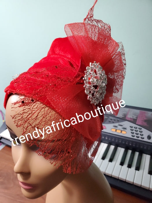 Red velvet Women-turban. One size fit all turban. Beautiful flower side design with a side brooch to add decor to your turban. Soft velvet material