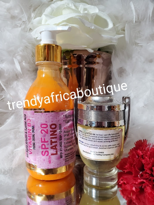 • Fast action: OMEK WHITENING OIL +Latino skin whitening body lotion 300ml bottle and Vitamin B. Spf 20. Skin booster/promixing lotion