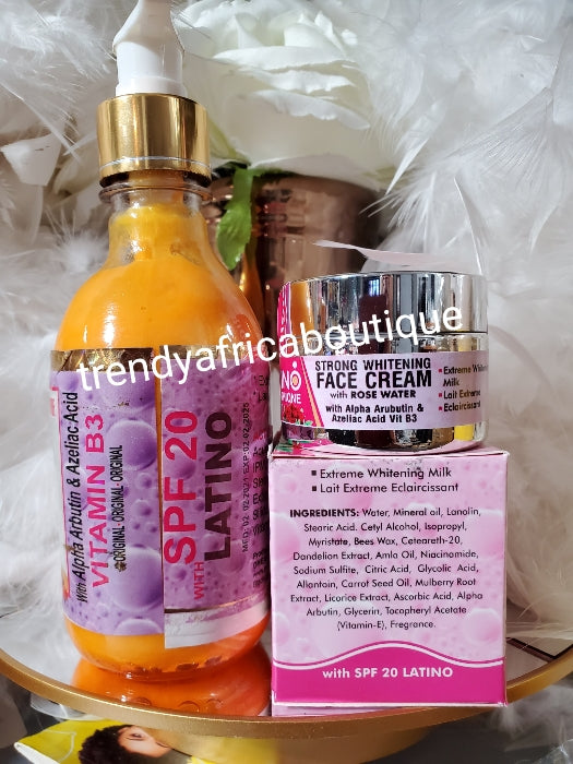 Another banga!! 2pcs set; Latino skin whitening milk, and face cream with Rose water 👌 With alpha arbuti, Azeliac acid and Vitamin B. Spf 20. Skin Whitening by OMEK!!