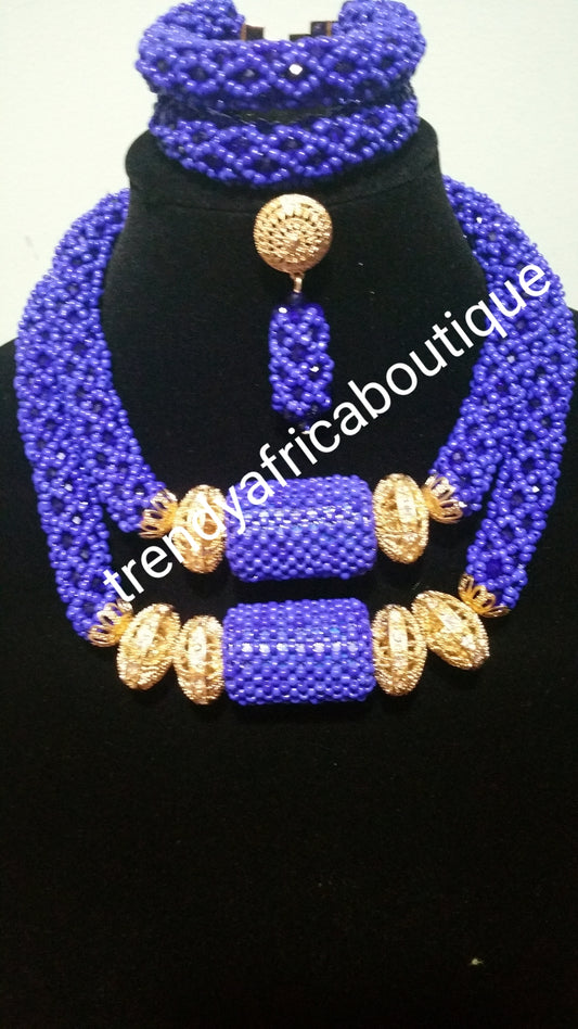 Sale: Multi Rows royal blue/turquoise beaded necklace/jewelry set. Nigerian wedding beads in 3 piece set. Also have coral-necklace set