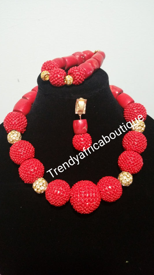 Sale: Nigerian/Edo Coral beaded necklace set. 3pcs traditional Edo coral-necklace set