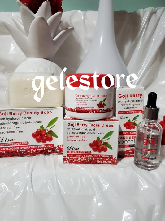 3pcs combo: DISA Goji Berry anti-aging, anti wrinkle facial cream, soap and face serum. Formulated with hyaluronic acid, retinol etc. For all skin types