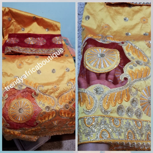 • Gold silk George fabric. Embriodered/sequence with wine matching net blouse. Sold as a set. Indian-George use for Nigerian wrapper, skirt/ blouse or dresses. Aso-ebi George