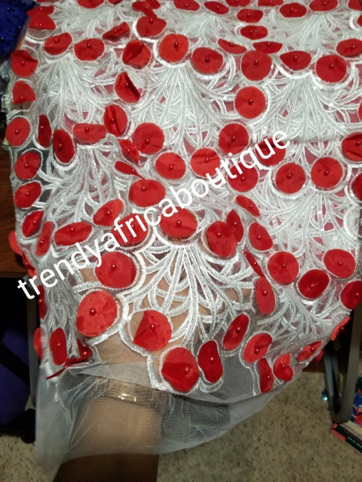 New arrival top quality White handcut sequence french lace embellished with Red petals. African Frwnch lace fabric sold per 5yds. White/Red. Nigerian weddings and big parties