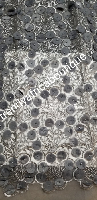 Latest French lace design. Gray handcut sequence Celebrant French lace fabric. Embellish with all over petals to perfection. Sold per 5yds. Celebrant/bridal lace fabric