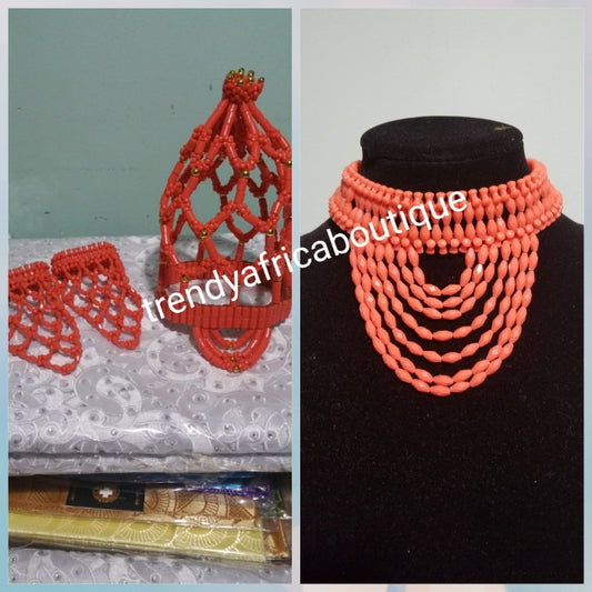 • 3pcs set Bridal-accessories for Nigerian Traditional wedding ceremony. Made with coral beads Head piece, necklace and shawl/blouse use by Bride. Edo/Bini Traditionall wedding. Sold as a set