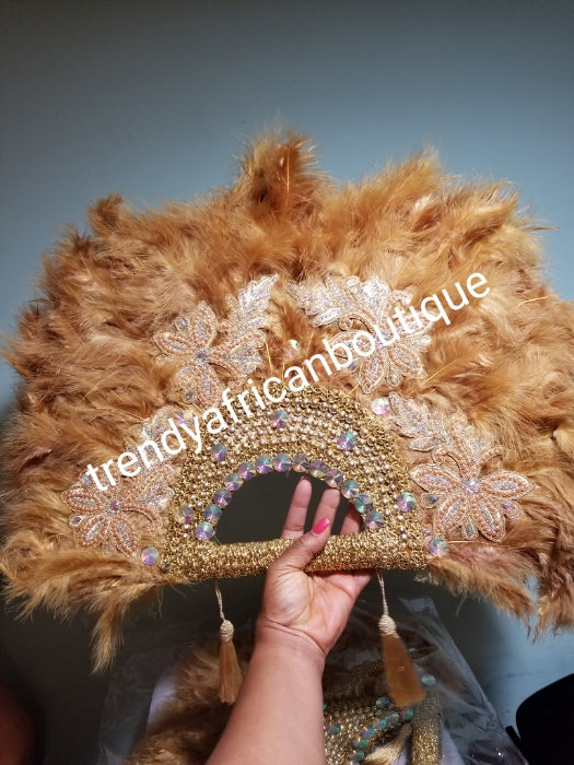 • Large feather hand fan in beautiful Gold. Bridal Accessories hand fan for celebrant. Fluffy feathers  with handle and 2 drop tassels, flower petals and stone work