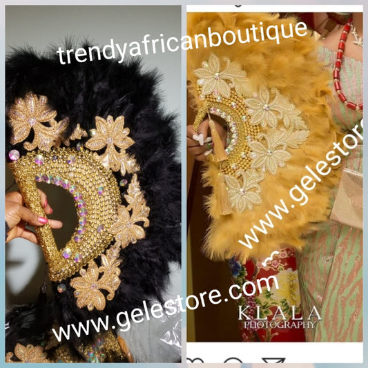 • Large Black/gold color, Nigerian  made fluffy Feather hand fan. Hand made same front and back design with gold handle, 2 drop tassels and gold petals and beads  Bridal-accessories design with beads and flower petal. Model shown is gold color