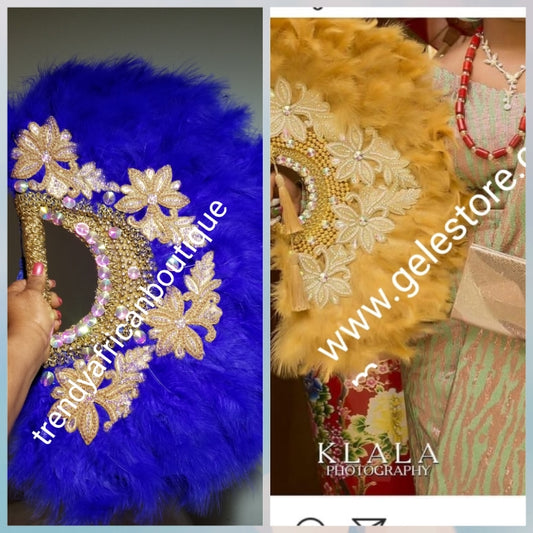 • Large Royal blue/gold color, Nigerian  made fluffy Feather hand fan. Hand made same front and back design with gold handle, 2 drop tassels and gold petals and beads  Bridal-accessories design with beads and flower petal.