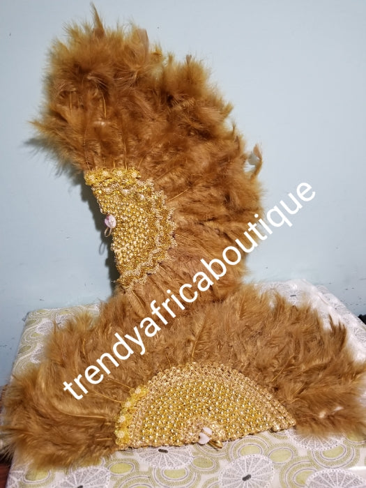 Gold Feather hand fan. Large moon shape hand fan Nigerian Bridal-accessories front and back middle design with beads and flower petal. Limited quantity. 25" long x 14" wide. Small handle to hold your fan. Very class