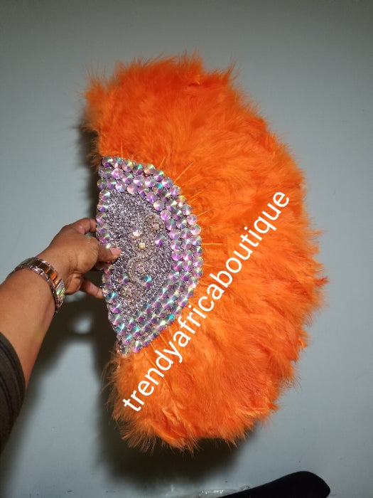 New arrival Orange Feather hand fan. Medium size moon shape hand fan Nigerian Bridal-accessories front and back design with gold beads and flower petal. Limited quantity. 19" long + 14" wide. Small handle to hold your fan. Very classy