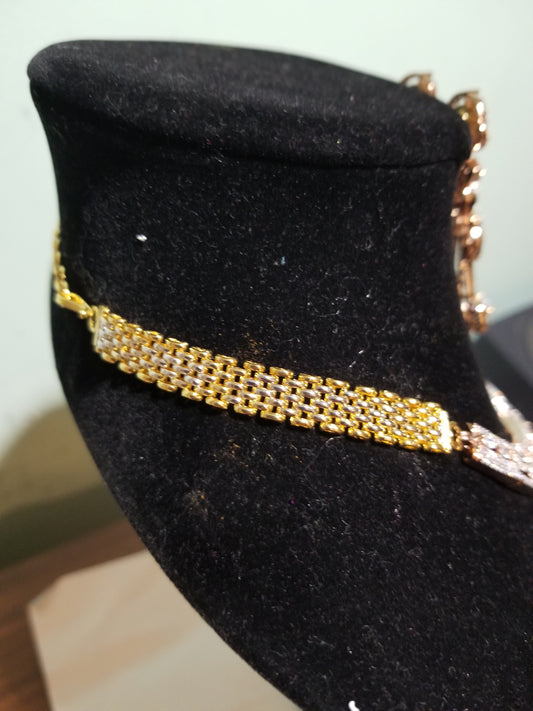 • Special offer: New arrival 2pcs. America diamond jewelry set in 22k Electroplated rose Gold plating in high quality/mounted with CZ stones setting, hypoallergenic. Classic chandelier choker necklace and, drop earrings. Very light weight Bridal-accessories