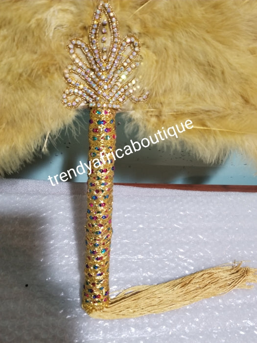 • Gold, Nigerian hand made Feather hand fan. Custom made, front/back same design. Large size fluffy feather fan Nigerian Bridal-accessories design with flower stoned  petal, long multicolored handle with tassles. Nigerian Celebrant  accessories