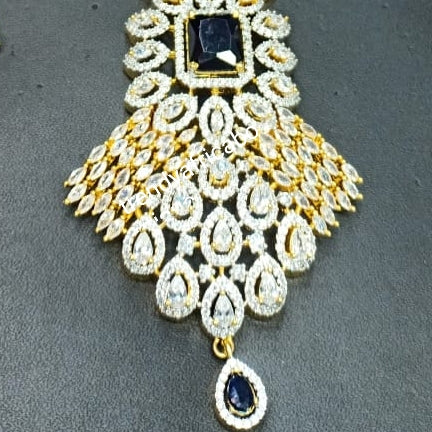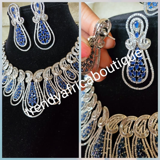 New arrival 4pcs celebrant set. America diamond jewelry set in 22k Electroplated high quality, mounted with CZ clear stones setting and Navy blue Stone accent. hypoallergenic. Classic choker drop necklace and, drop earrings. Bridal-accessories