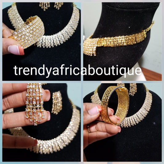 New arrival 4pcs celebrant set. High grade 22k Electroplated quality CZ stones setting , hypoallergenic. Classic celebrant choker necklace, Bangle, drop earrings and ring. Bridal-accessories.