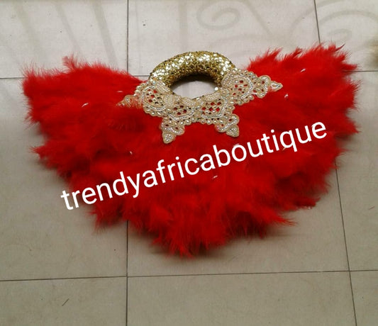 RED/GOLD Nigerian hand made Feather hand fan. Custom made, front/back same design. Large size fluffy feather fan Nigerian Bridal-accessories design with Gold flower petal, Nigerian celebrant accessories