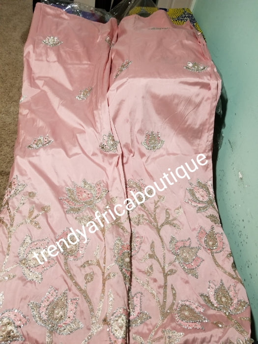 • Sweet dusty pink Nigerian Traditional Silk embroidery George wrapper. Quality embroidery + Hand Beaded/stones design in beautiful soft pink color 5yds + 1.8 matching net blouse. Igbo/delta bride outfit. Small-George.