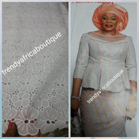 • On Sale: Top quality pure white atiku swiss voile lace fabric for Nigerian Men native outfit. Soft quality fabric. Can be use for agbada/3pc outfit for men. Sold per 5yds. Price is for 5yds
