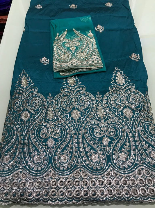 New arrival of Teal color Silk embroidery george. Embriodered with gold. Super quality Indian-George for making Aso-ebi dresses, Nigerian party dress. Contact us for group order. Sold as 5yds + 1.8yds matching net for blouse combo