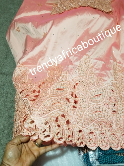 • Special sale of quality Peach Embroidery silk George wrapper + net blouse. Small-George. Sold as a set of 5yds wrapper and 1.8yds matching blouse